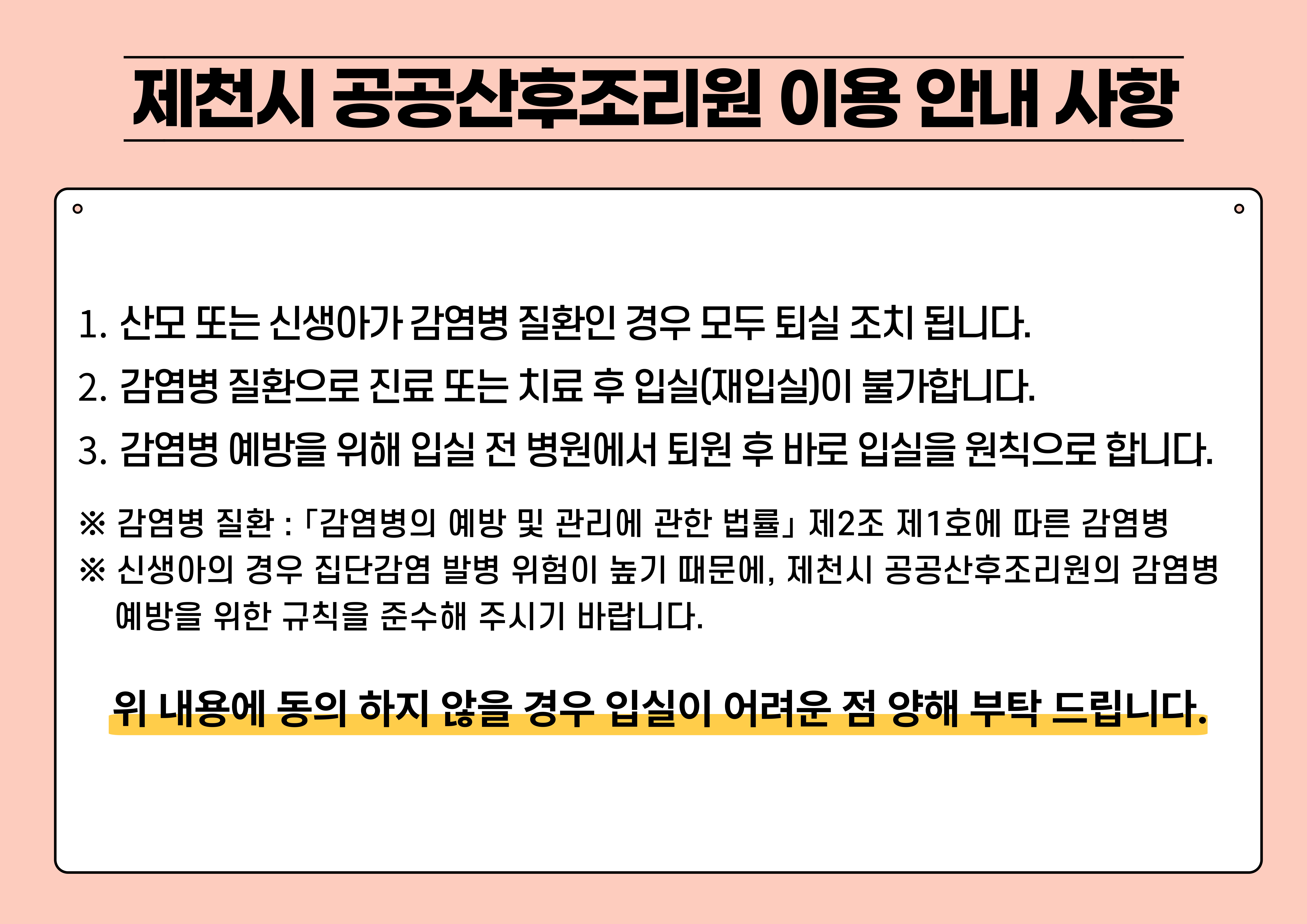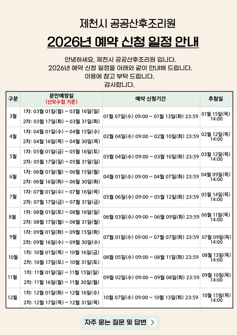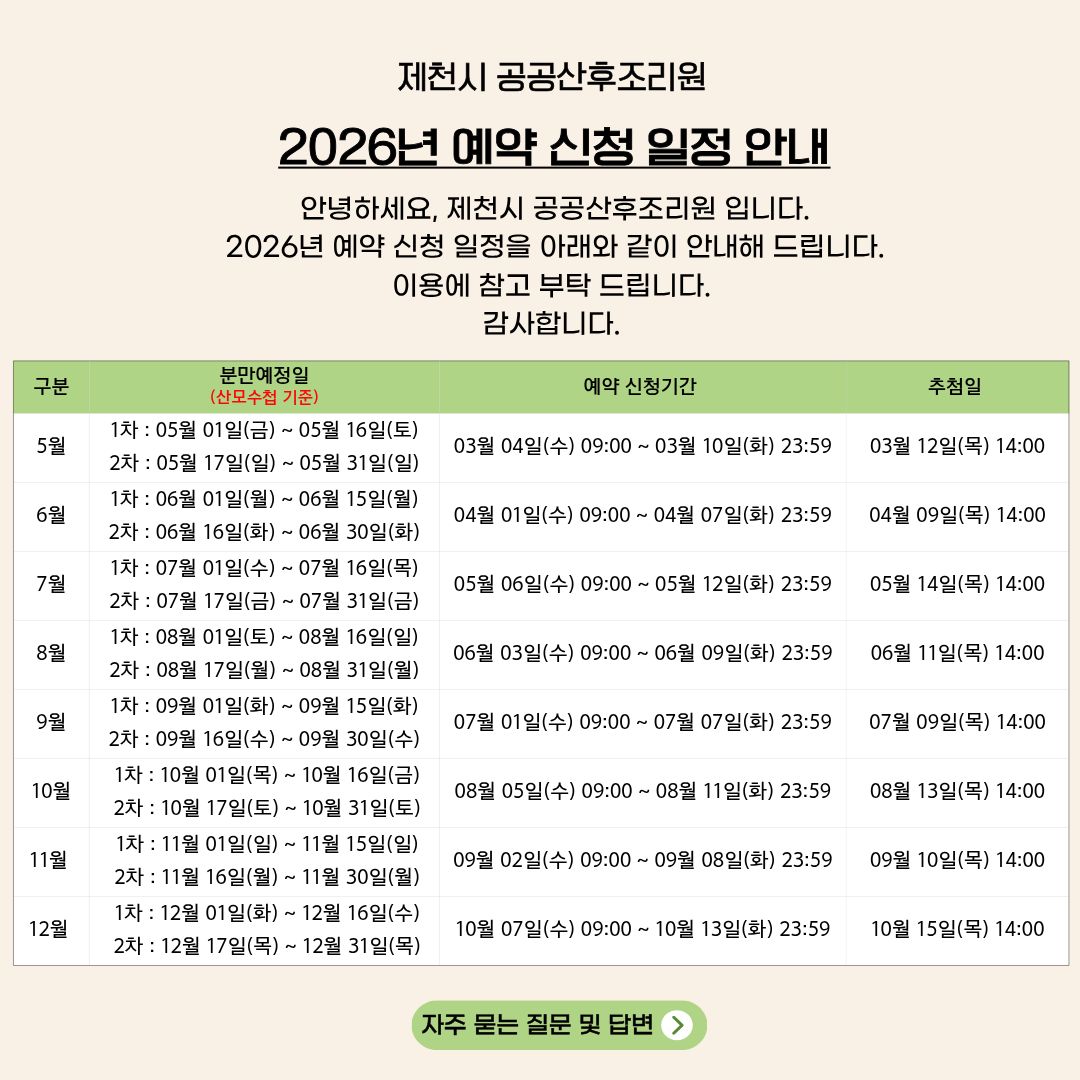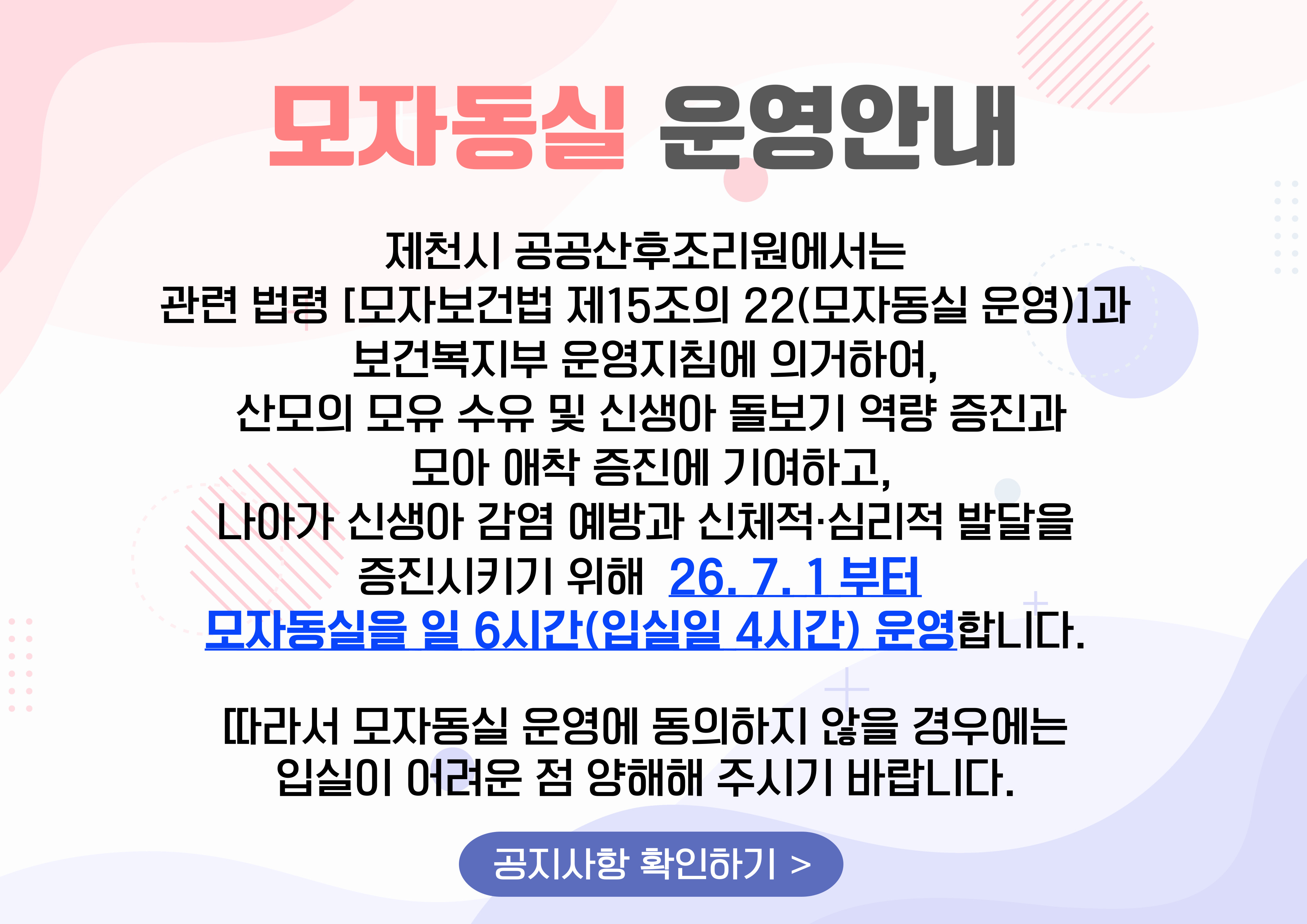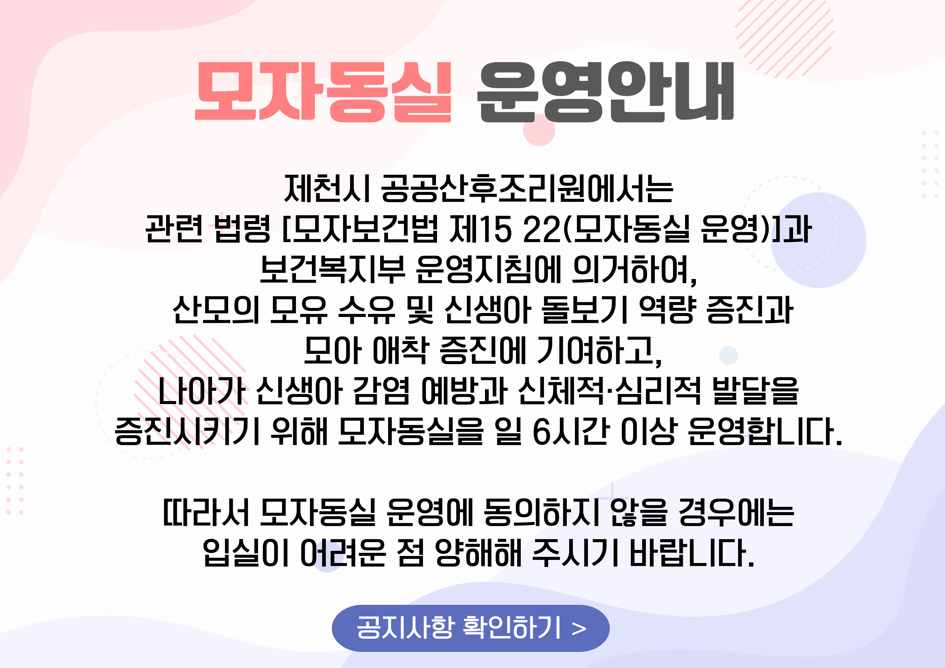제천시공공산후조리원은 출산 직후 산모와 신생아의 회복과 돌봄의 시간을더 안전하고, 더 따뜻하게 보낼 수 있도록 준비된 공간입니다.